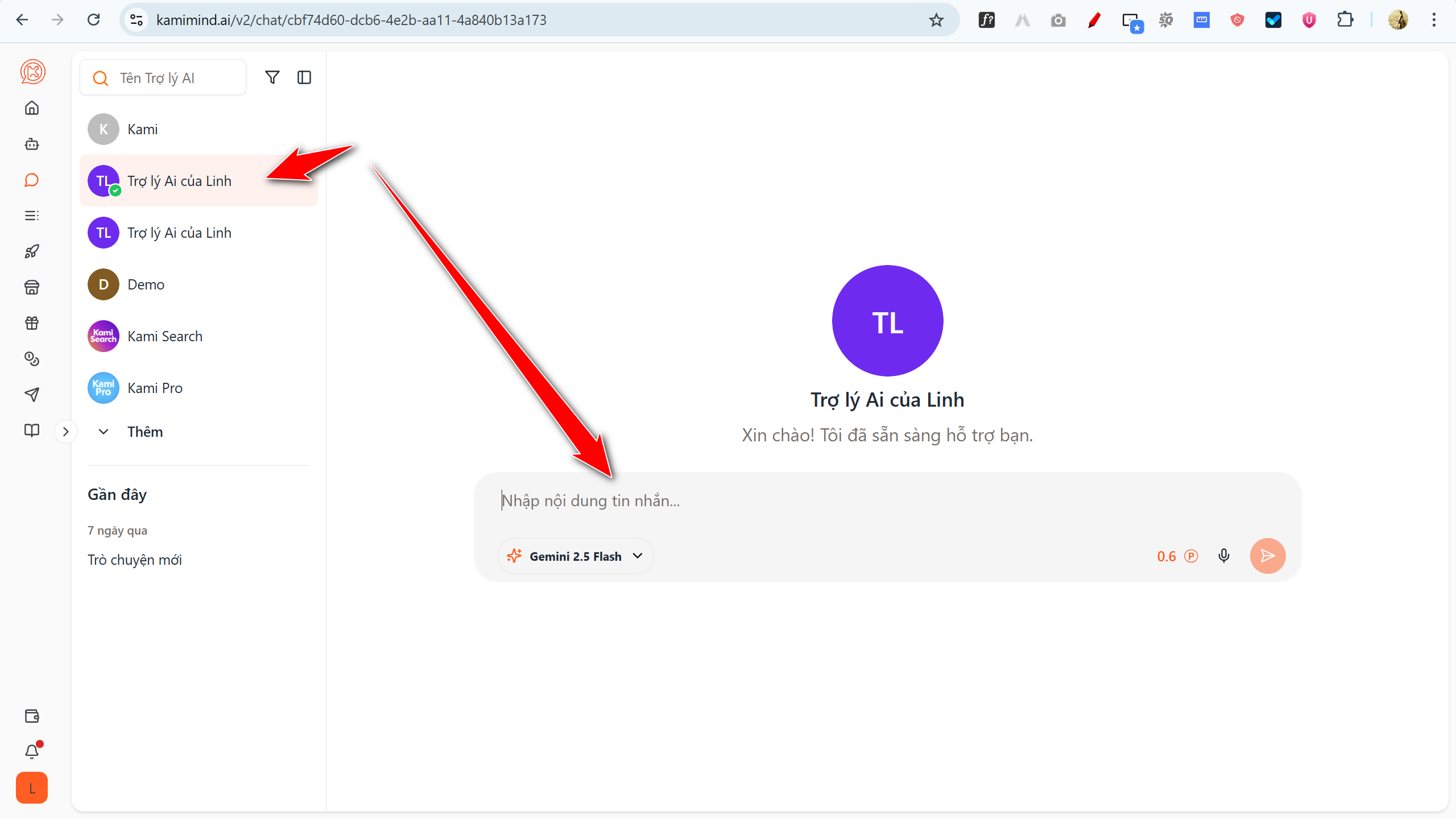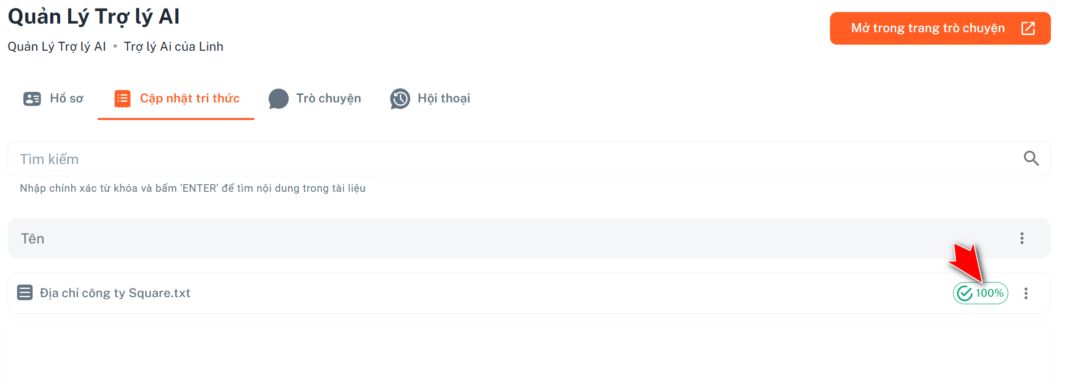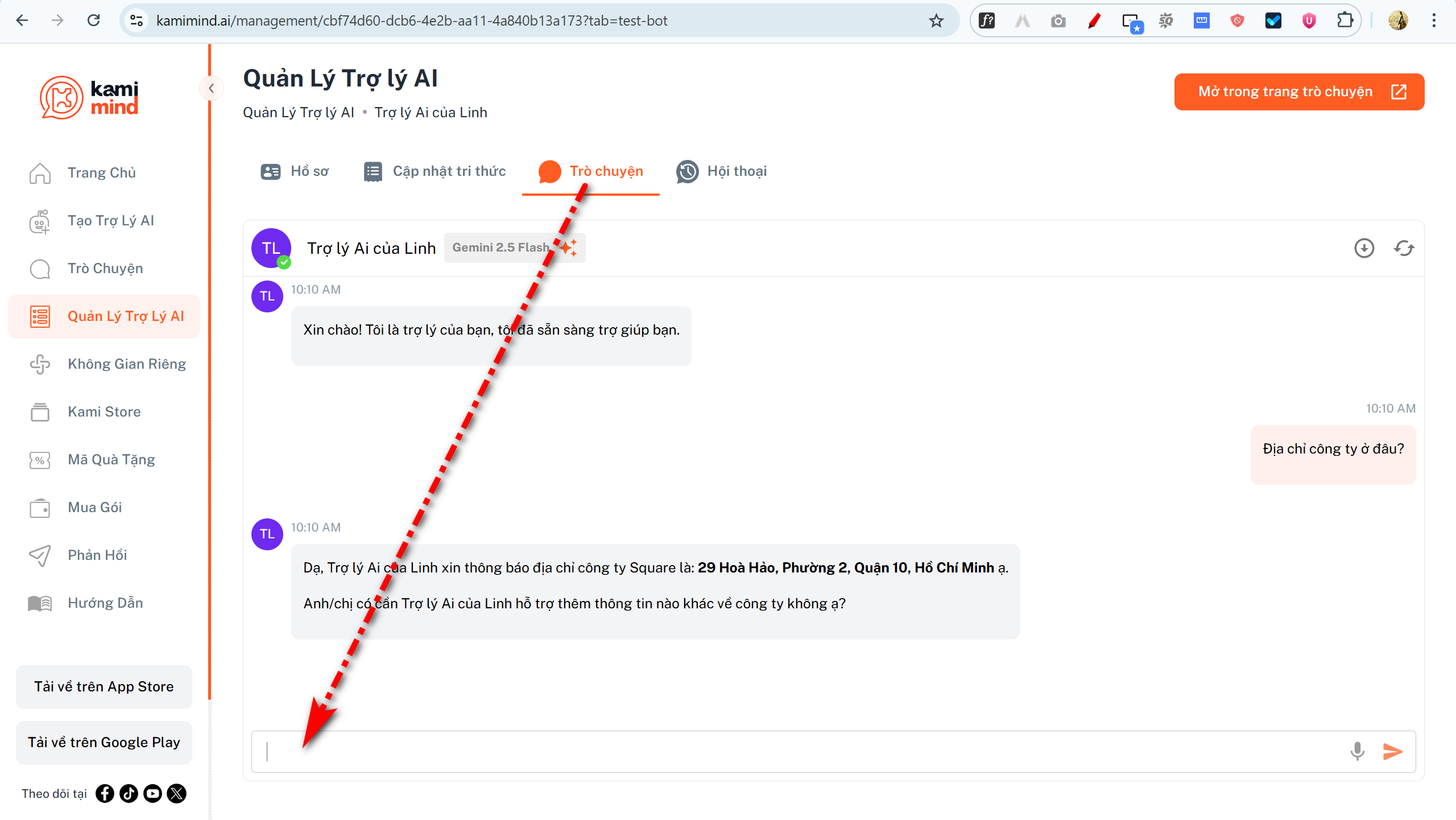 - Để test lại xem Trợ lý Ai của bạn đã học tốt chưa, vào mục Trò Chuyện >> nhập câu hỏi >> Enter để Ai trả lời