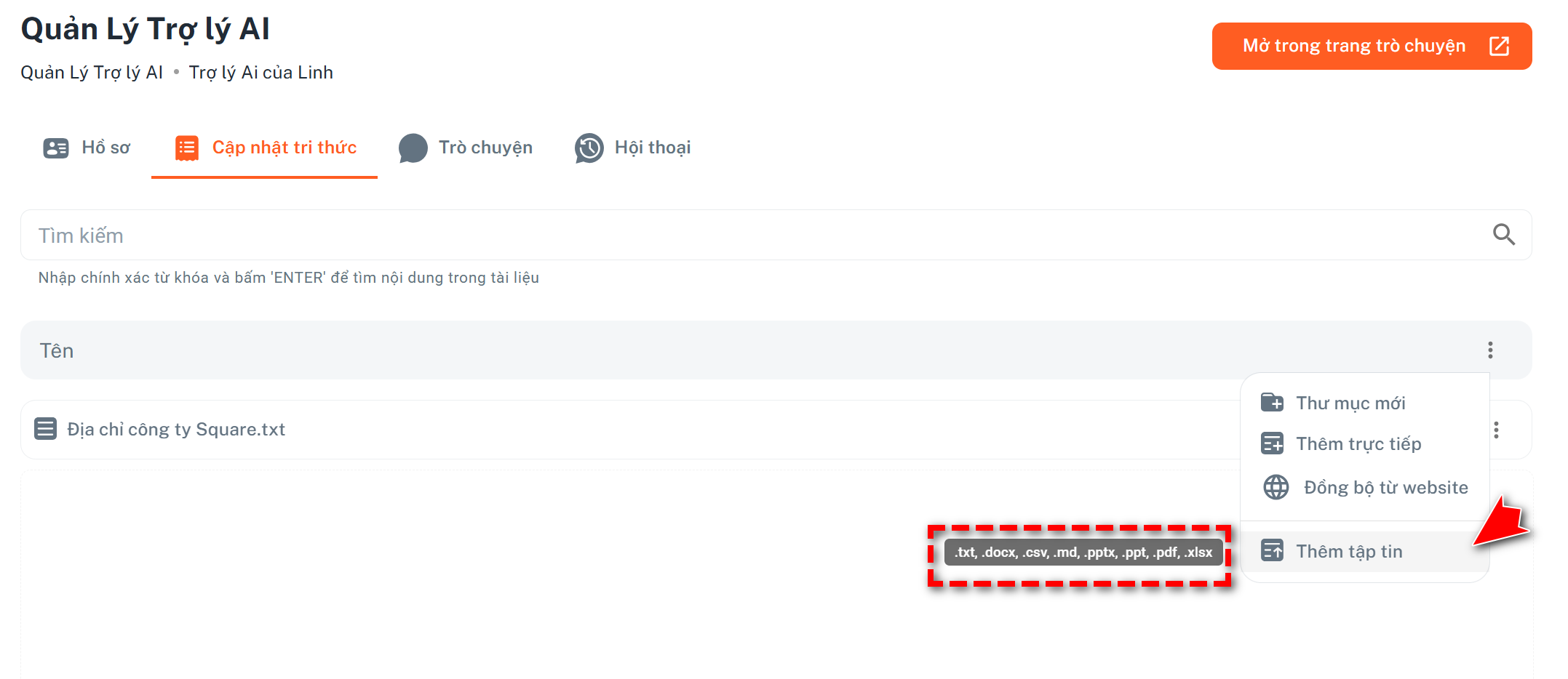 - Nếu chọn “Thêm tập tin” bạn chú ý rằng chỉ upload được các file sau: .txt, .docx, .csv, .md, .pptx, .ppt, .pdf, .xlsx